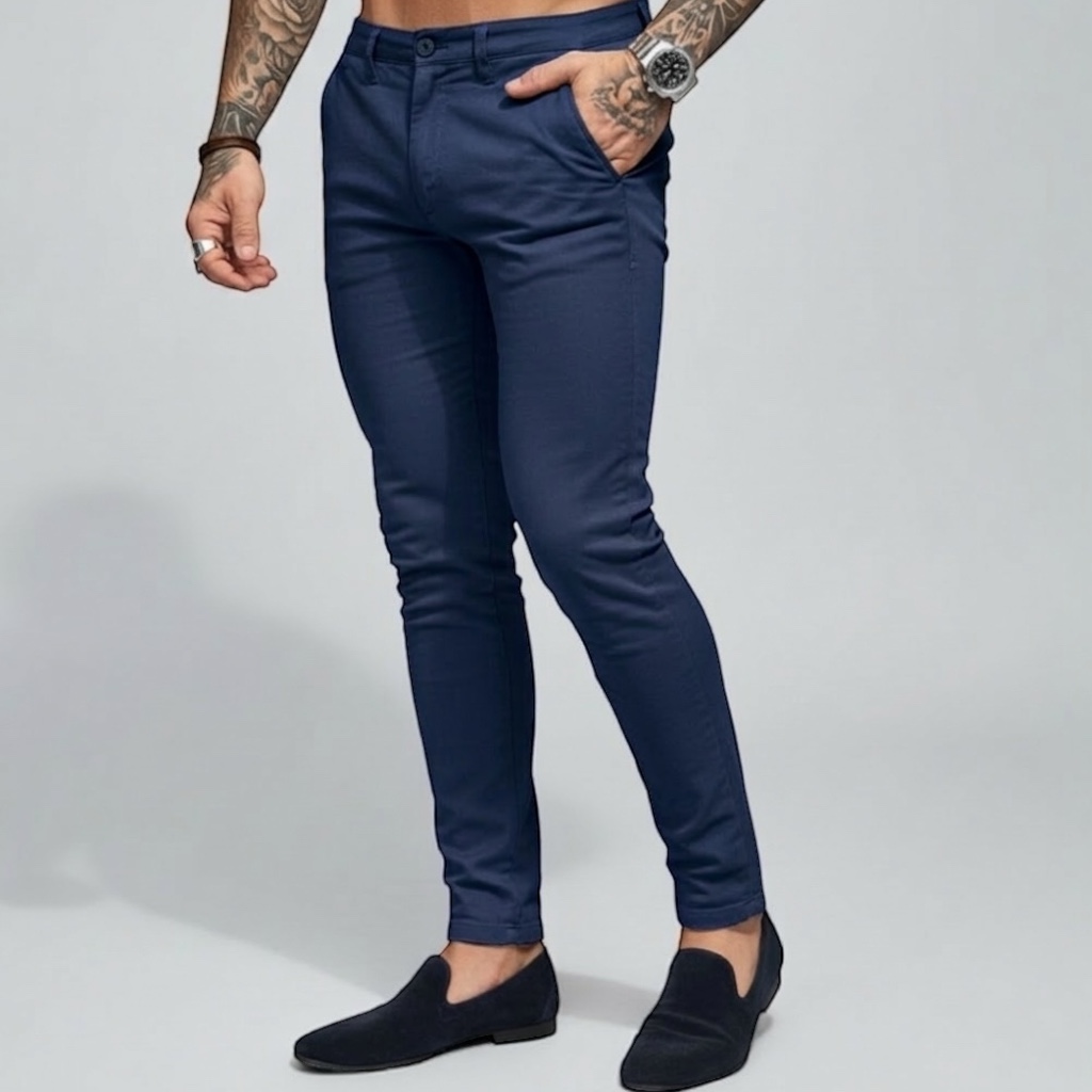 Confeccionada com 98% algodão e 2% elastano, oferece toque macio, leve elasticidade e muito conforto para o dia a dia, mantendo o estilo da alfaiataria com liberdade de movimento.