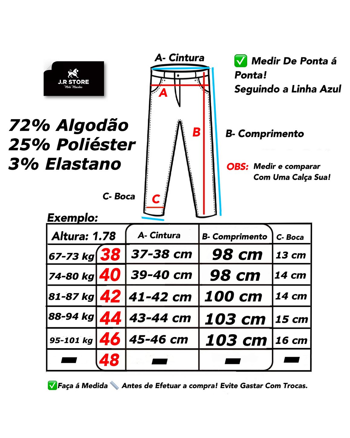 - Características: Calça dois bolsos faca frontal, dois bolsos embutidos traseiro, logo da marca parte de trás, fechamento frontal com ziper e um botão.